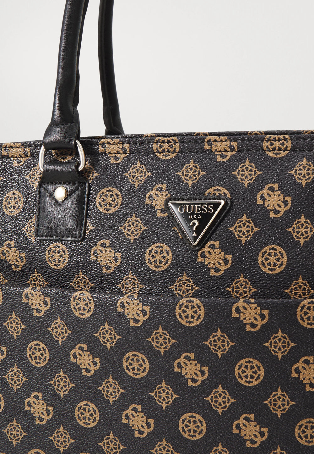 ارتقِ بأسلوبك اليومي مع حقيبة توت مونوغرام جيس الأيقونية. تُظهر هذه الإكسسوارة الراقية نقشة المونوغرام المميزة من جيس، والمقدمة بجمال في درجات اللون البني والذهبي الغنية على خلفية أنيقة باللون البني الداكن أو الأسود. صُممت هذه الحقيبة لتجمع بين الأناقة والعملية، وتتميز بمقابض علوية متينة باللون الأسود ولوحة معدنية مثلثة بارزة تعرض بفخر شعار 'GUESS U.S.A.' في الأمام. يفتح تصميمها المنظم ليكشف عن مساحة داخلية واسعة بشكل ملحوظ، مما يجعلها المزيج المثالي من الموضة والوظائف لجميع ضرورياتك اليومية. قطعة مميزة خالدة تجمع بسهولة بين الفخامة والمنفعة.